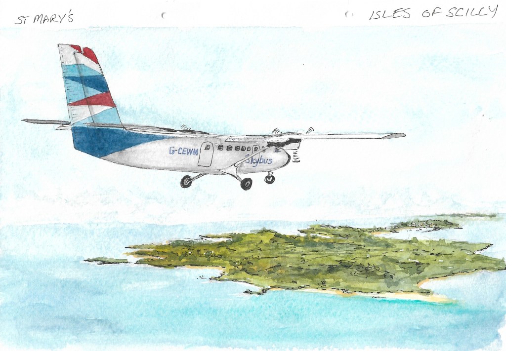 How do you sketch the plane you are flying on? The plane was actually on the ground at Lands End airport, the image of the islands is a photo taken from the plane.