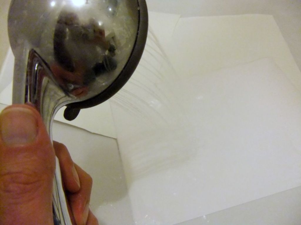 Next you need to soak the paper. You can use a bath, sink or shower. Make sure the paper is thoroughly wet on both sides and leave it to soak for a minute or so, re-wetting if necessary. Be careful when handling the wet paper – use shower/taps on a low gentle setting – it is easy to damage the paper surface and sizing by rough handling.